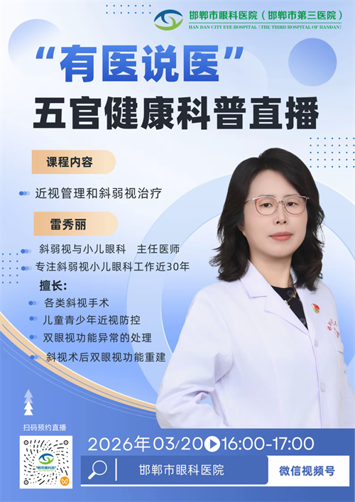 3 月 20 日(周五)16:00,斜弱视与小儿眼科主任医师雷秀丽将在 “邯郸市眼科医院” 微信视频号直播,深度解析近视管理与斜弱视治疗核心话题。欢迎大家准时收看,评论区留言提问,我们直播间不见不散!