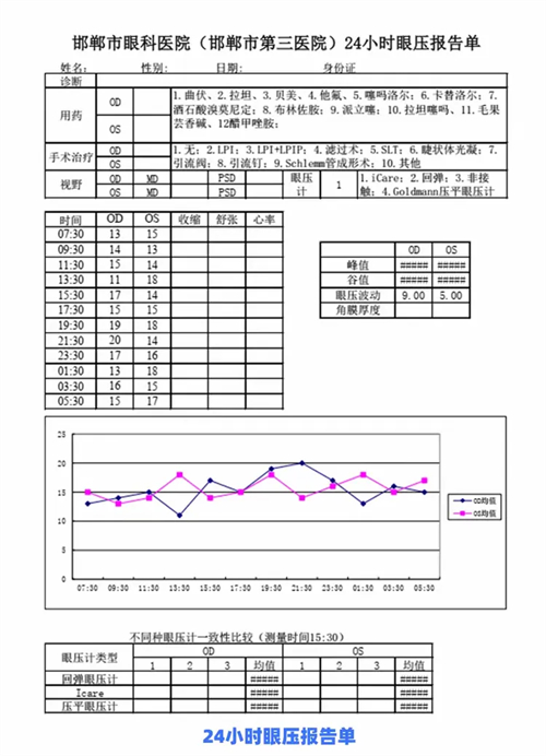我院青光眼科设有专用 24 小时眼压测量室,配备多类型国际先进设备,由专业技术人员严格遵循国际标准体位与时间节点,每 2 小时监测一次,全程规范采集数据,最终提供包含眼压波动曲线、峰值、谷值的详细 24 小时眼压报告。