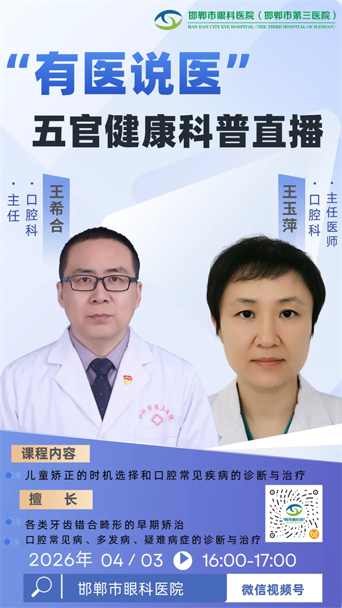 4 月 3 日(周五)16:00,口腔科主任王希合、主任医师王玉萍将在 “邯郸市眼科医院” 微信视频号直播,讲解儿童矫正的时机选择和口腔常见病的诊断与治疗。欢迎大家准时收看,评论区留言提问,我们直播间不见不散!